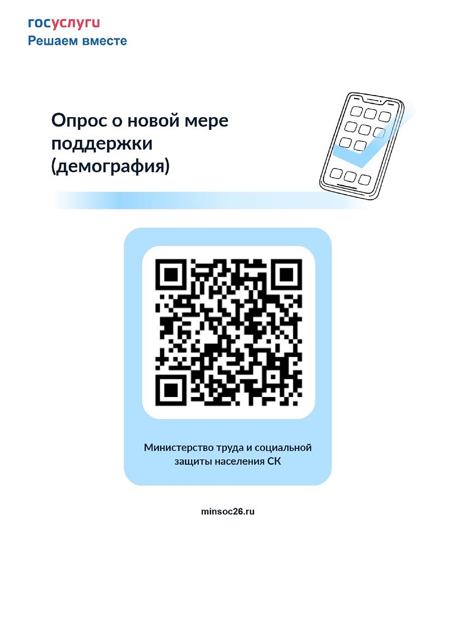 Министерством труда и социальной защиты населения Ставропольского края на платформе обратной связи федеральной государственной информационной системы «Единый портал государственных и муниципальных услуг» размещен региональный опрос на тему: «Демография. О новой мере поддержки, направленной на стимулирование молодых женщин к беременности».