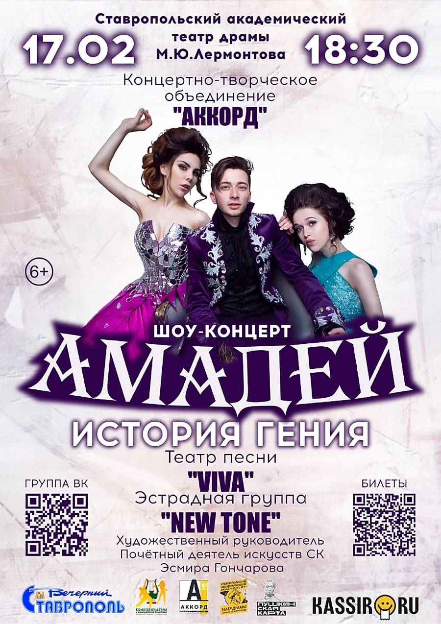 В концертной шоу-программе "Амадей" Театра песни "VIVA", посвященной разным периодам жизни гениального композитора Вольфганга Амадея Моцарта, будут исполнены музыкальные номера в стиле «РОК». Профессиональные артисты, яркие костюмы, и все это под аккомпанемент музыкантов группы "NEW TONE", перенесут зрителя в эпоху конфликта силы и уникального таланта, ревностного отношения к музе и красивой любви.